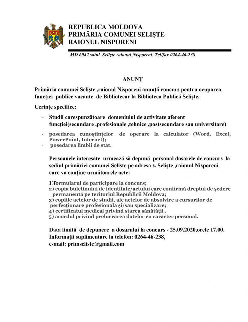 Primăria comunei Seliște ,raionul Nisporeni anunță concurs pentru ocuparea funcției publice vacante de Bibliotecar la Biblioteca Publică Seliște